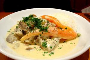 5- La sauce devient veloutée, pas épaisse, elle nappe la cuiller. Verser alors le jus de citron et laisser cuire encore 2 mn. Pendant ce temps, battre la crème ou les yaourts avec le jaune d'oeuf, sel et poivre si besoin est. Ajouter cet appareil à la sauce veloutée et mélanger.