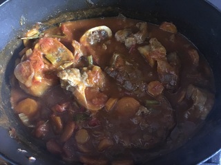 - Ajoutez les tomates en quartiers, les zestes, le bouquet garni, le basilic, (la sauge si vous en avez) et le bouillon Kub, et disposez les ossi (morceaux de viande).